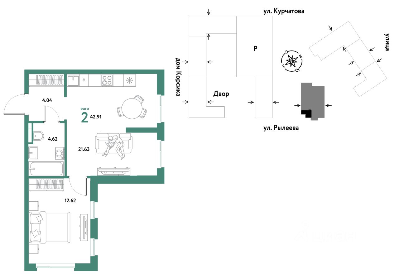 Продается 2комнатная квартира на 24 этаже от застройщика Страна Девелопмент. Площадь квартиры 42,67 кв. м.