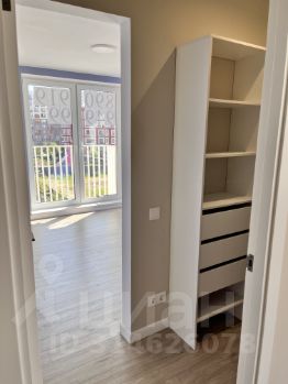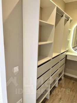 В квартире в зоне спальни сделана гардеробная, оборудованная встроенной мебелью,.
