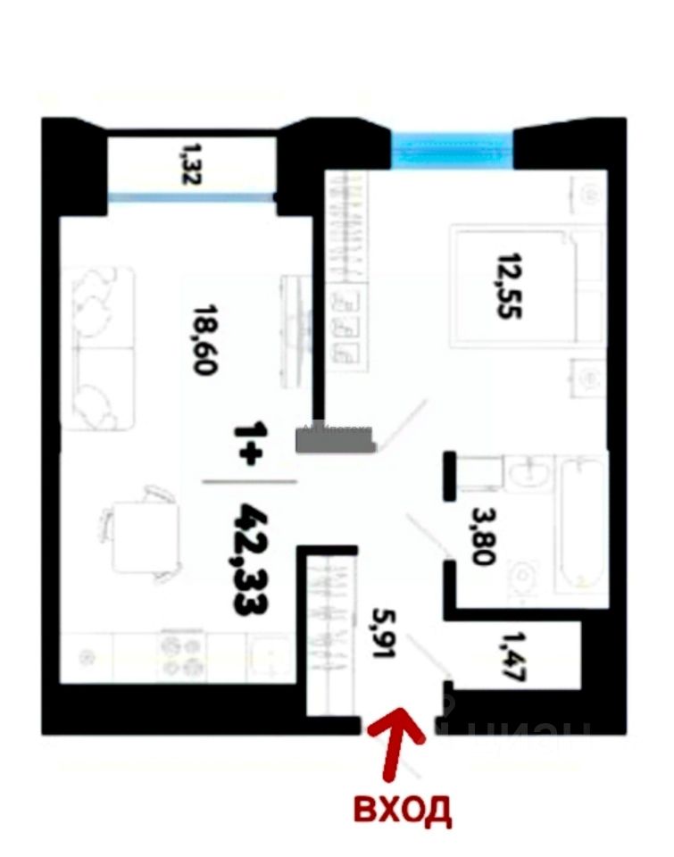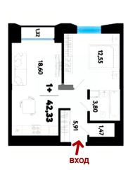 Общая площадь 42,5 кв.м.+ балкон, можно сделать евродвушку, кухня-гостиная и отдельная комната.