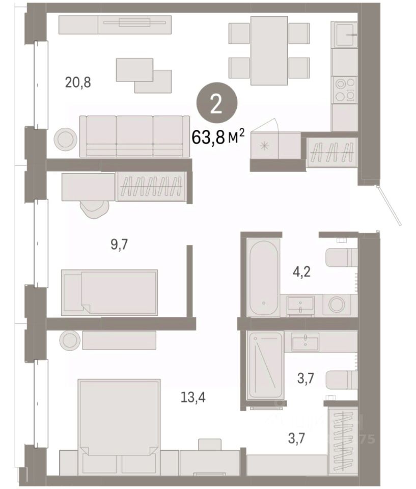 Двухкомнатная квартира от застройщика с предчистовой отделкой в Кварталы "На Минской" на 2 этаже. Общая площадь: 63.77 кв.м., жилая: 25.2 кв.м., площадь просторной кухни-гостиной: 21.6 кв.м. Комнаты изолированные, все окна выходят на одну сторону. В квартире два совмещенных санузла. Высота потолков 2.7 м.