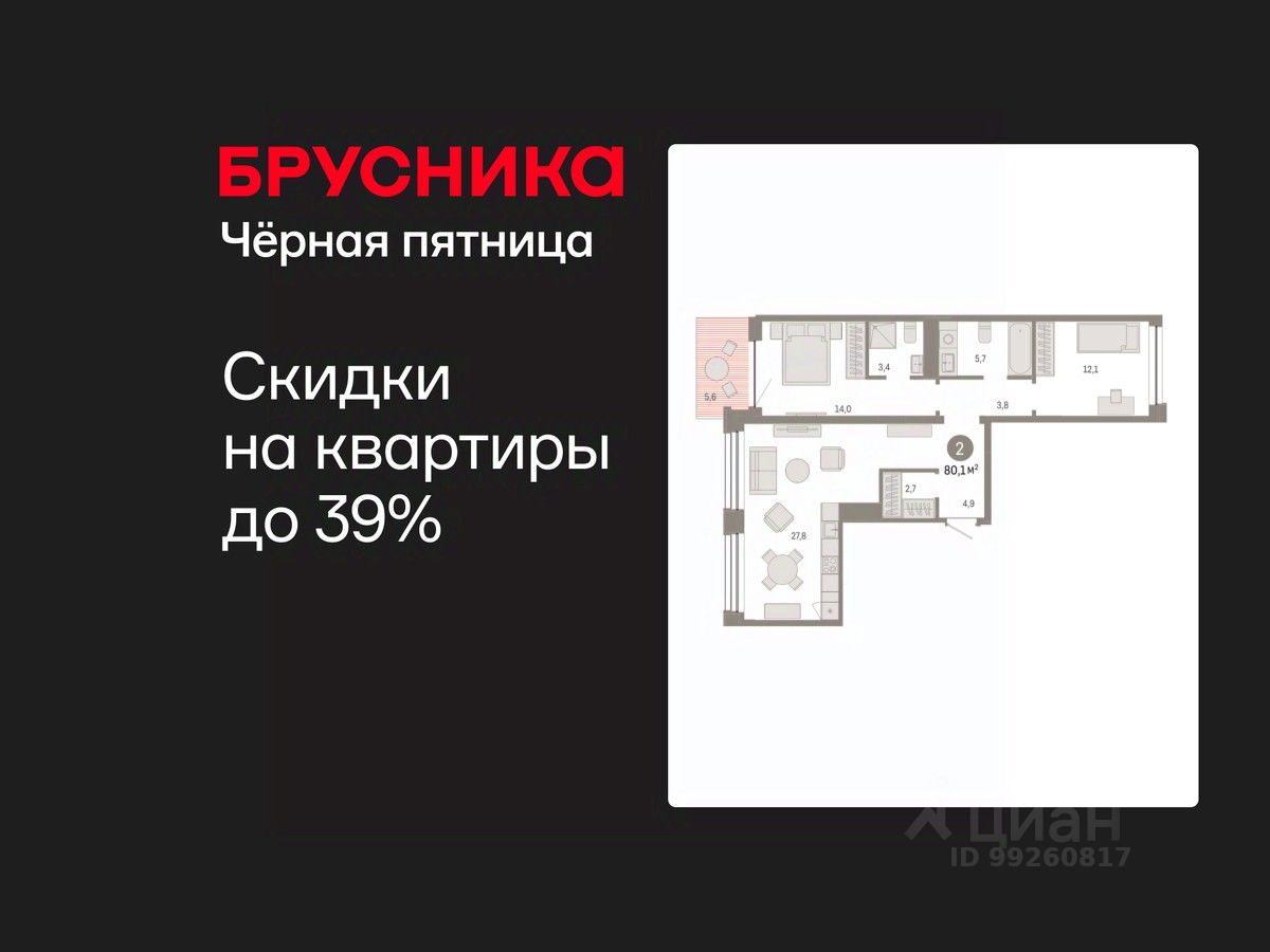 2-комн. квартира с предчистовой отделкой в ЖК "Дом у озера" на 5 этаже. Общая площадь: 80.09 кв.м., жилая: 26.1 кв.м., площадь просторной кухни-гостиной: 27.8 кв.м. Квартира - распашонка, без проходных комнат, окна выходят на paзные стороны дома. В квартире один балкон, два совмещенных санузла. Высота потолков 2.7 м.