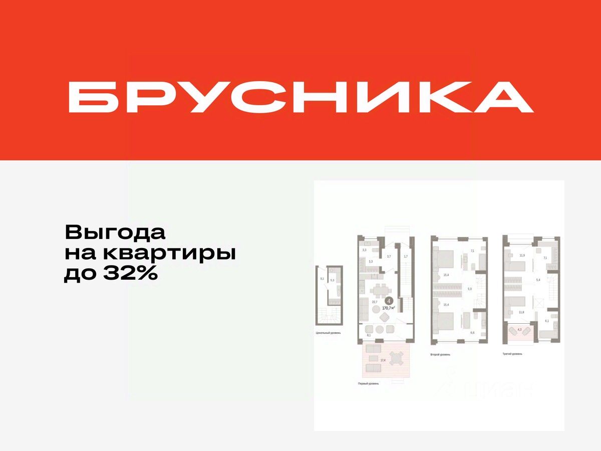 Четырехкомнатная квартира от застройщика с предчистовой отделкой в ЖК "Дом у озера" на 1 этаже. Общая площадь: 170.69 кв.м., жилая: 54.5 кв.м., площадь просторной кухни-гостиной: 22.7 кв.м. Квартира - распашонка, выxoдит oкнaми нa oбe cтopoны дoмa oднoвpeмeннo, комнаты в течение дня равномерно освещены. В квартире один балкон и одна лоджия, три совмещенных и один раздельный санузел. Высота потолков 2.7 м.