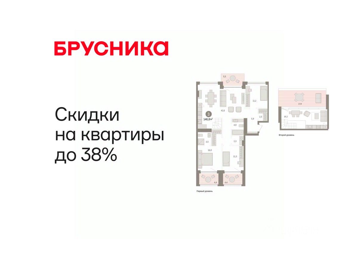Двухуровневая квартира с кухней-гостиной и тремя спальнями в Доме у озера. Особенности планировки: балкон, вид во двор, второй санузел, гардеробная, двухуровневая, лоджия, мастер-спальня, окно в коридоре, предчистовая отделка, разнесённые спальни, терраса на крыше, тёплая лоджия.