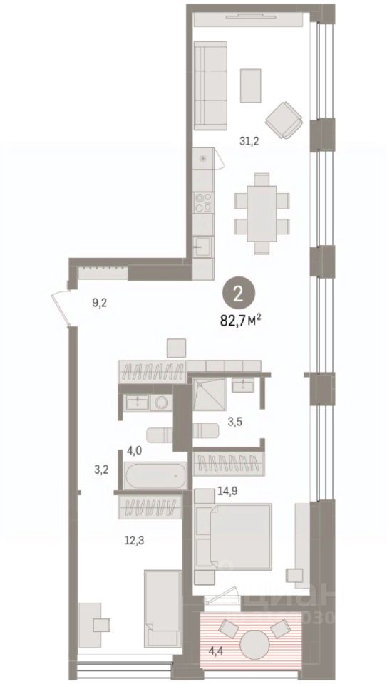 Квартира с кухней-гостиной и двумя спальнями в Доме у озера. Особенности планировки: вид во двор, лоджия, предчистовая отделка, мастер-спальня.