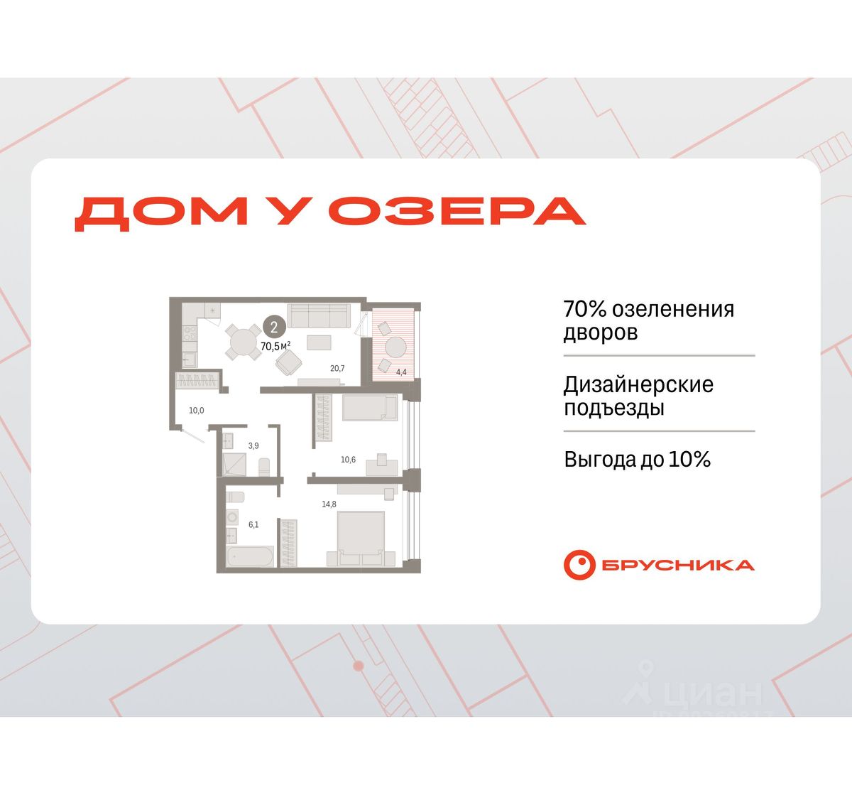 2-комн. квартира от застройщика с предчистовой отделкой в ЖК "Дом у озера" на 7 этаже. Общая площадь: 70.49 кв.м., жилая: 25.4 кв.м., площадь просторной кухни-гостиной: 20.7 кв.м. Комнаты изолированные, все окна выходят на одну сторону. В квартире одна лоджия, два совмещенных санузла. Высота потолков 2.7 м.