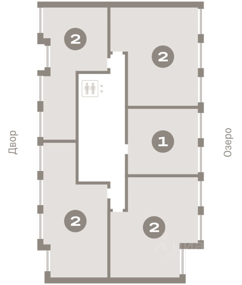 Квартира с кухней-гостиной и двумя спальнями в Доме у озера. Особенности планировки: гардеробная, вид во двор, предчистовая отделка, мастер-спальня, балкон.