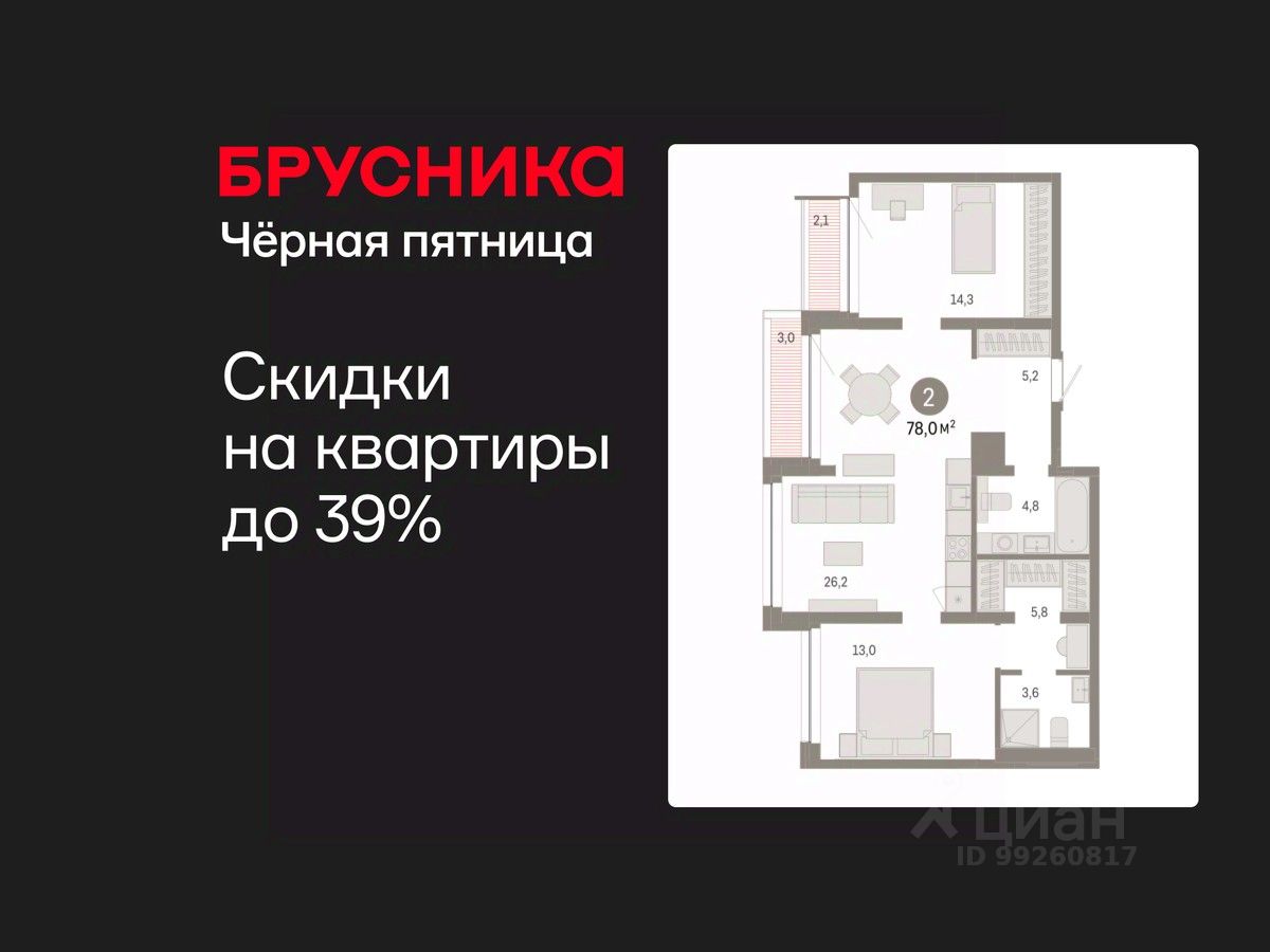 2-комн. квартира с предчистовой отделкой в ЖК "Дом у озера" на 5 этаже. Общая площадь: 78.02 кв.м., жилая: 27.3 кв.м., площадь просторной кухни-гостиной: 26.2 кв.м. Комнаты изолированные, все окна выходят на одну сторону. В квартире две лоджии, два совмещенных санузла. Высота потолков 2.7 м.