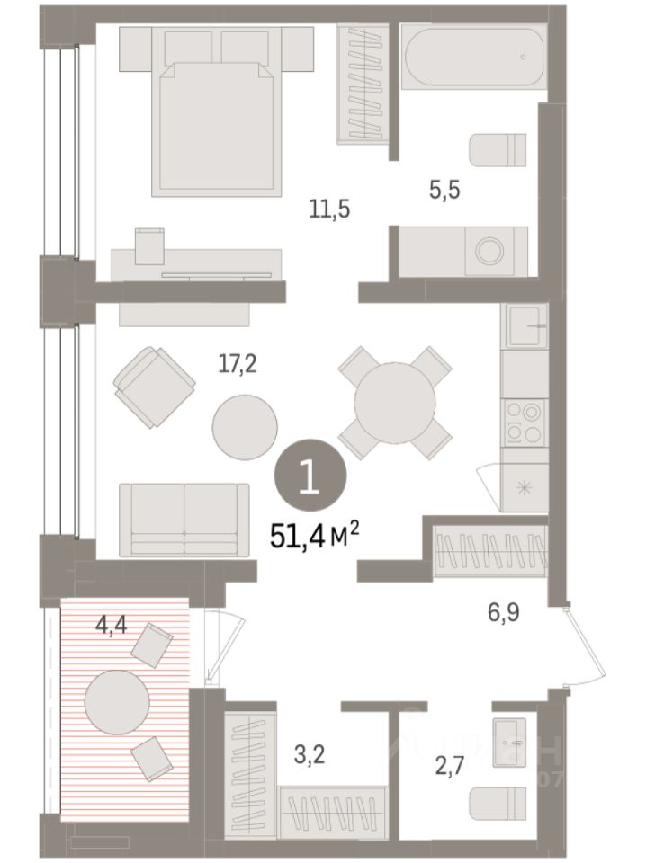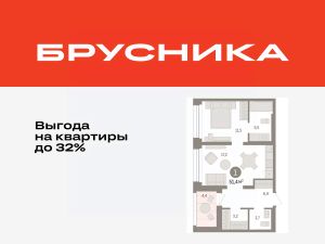 1-комн. квартира от застройщика с предчистовой отделкой в ЖК "Дом у озера" на 7 этаже. Общая площадь: 51.41 кв.м., жилая: 11.5 кв.м., площадь просторной кухни-гостиной: 17.2 кв.м. Все окна выходят на одну сторону. В квартире одна лоджия, один совмещенный и один раздельный санузел. Высота потолков 2.7 м.