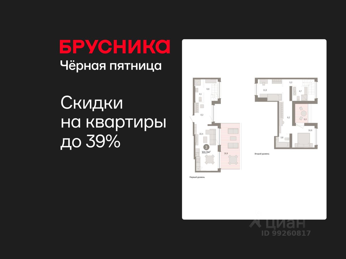 Двухуровневая квартира с кухней-гостиной и тремя спальнями в Доме у озера. Особенности планировки: второй санузел, окно в коридоре, двухуровневая, вид во двор, вид на озеро, лоджия, разнесённые спальни, предчистовая отделка, мастер-спальня, терраса, терраса на крыше.