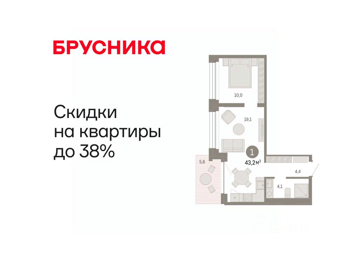 Квартира с кухней-гостиной и одной спальней в Доме у озера. Особенности планировки: балкон, вид во двор, предчистовая отделка.