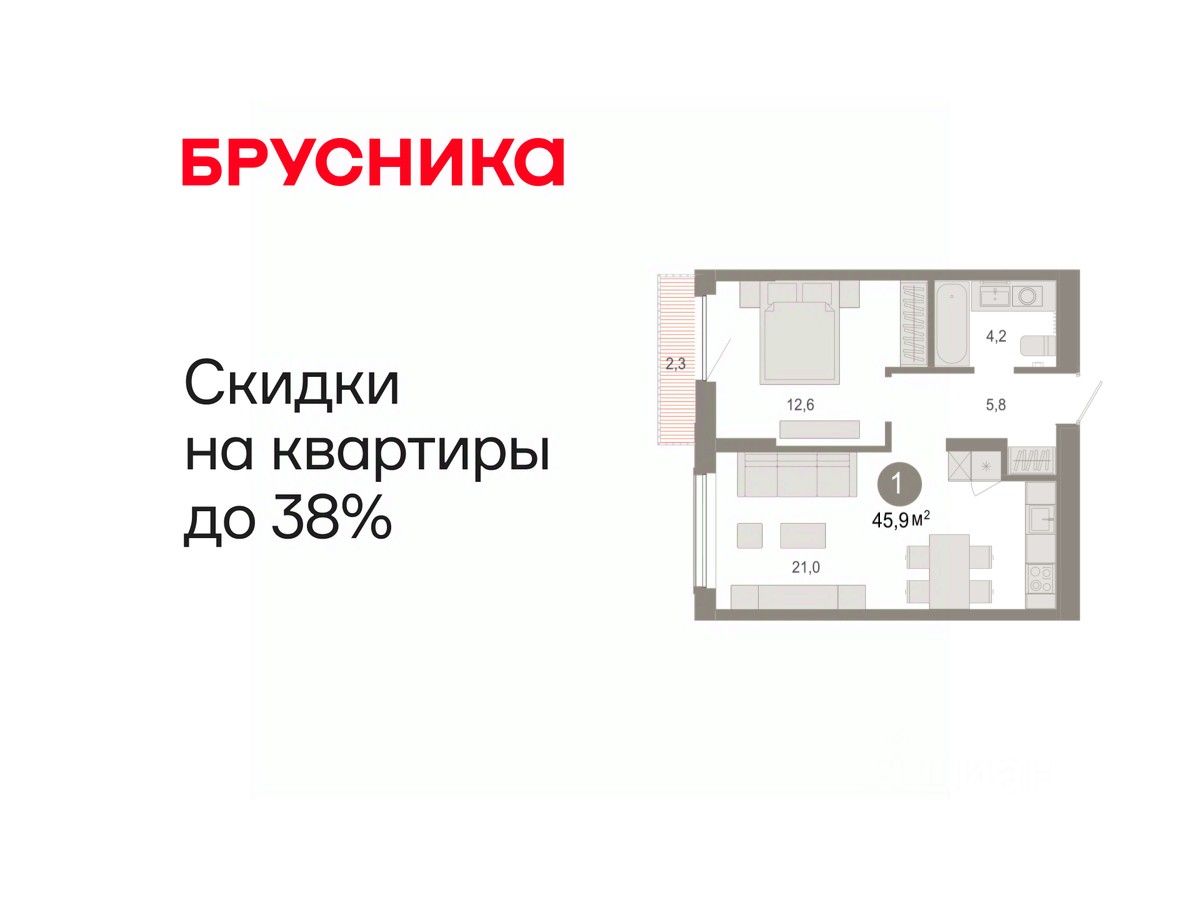 Квартира с кухней-гостиной и одной спальней в Октябрьском на Туре. Особенности планировки: балкон, предчистовая отделка.