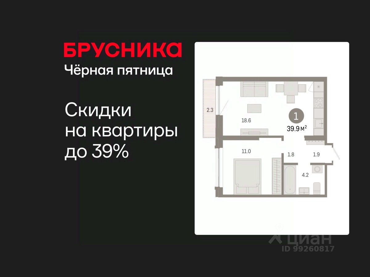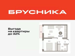 Квартира с кухней-гостиной и одной спальней в Октябрьском на Туре. Особенности планировки: рабочий кабинет, предчистовая отделка, балкон.