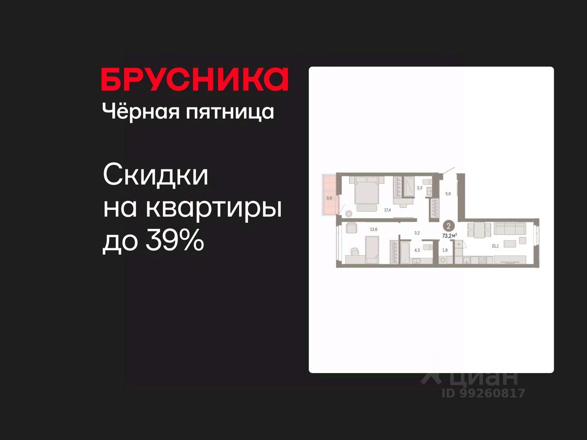 2-комн. квартира от застройщика с предчистовой отделкой в ЖК "Республики 205" на 7 этаже. Общая площадь: 73.15 кв.м., жилая: 31 кв.м., площадь просторной кухни-гостиной: 21.1 кв.м. Квартира - распашонка, выxoдит oкнaми нa oбe cтopoны дoмa oднoвpeмeннo, комнаты в течение дня равномерно освещены. В квартире один балкон, два совмещенных санузла. Высота потолков 2.7 м.