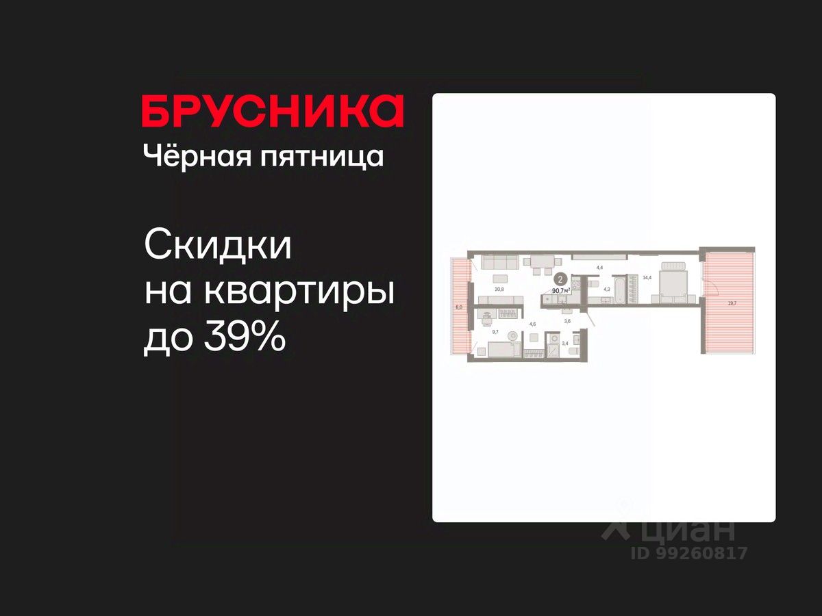 Просторная двухкомнатная квартира с предчистовой отделкой в ЖК "Республики 205" на 2 этаже. Общая площадь: 90.68 кв.м. Высота потолков 2.7 м.