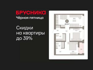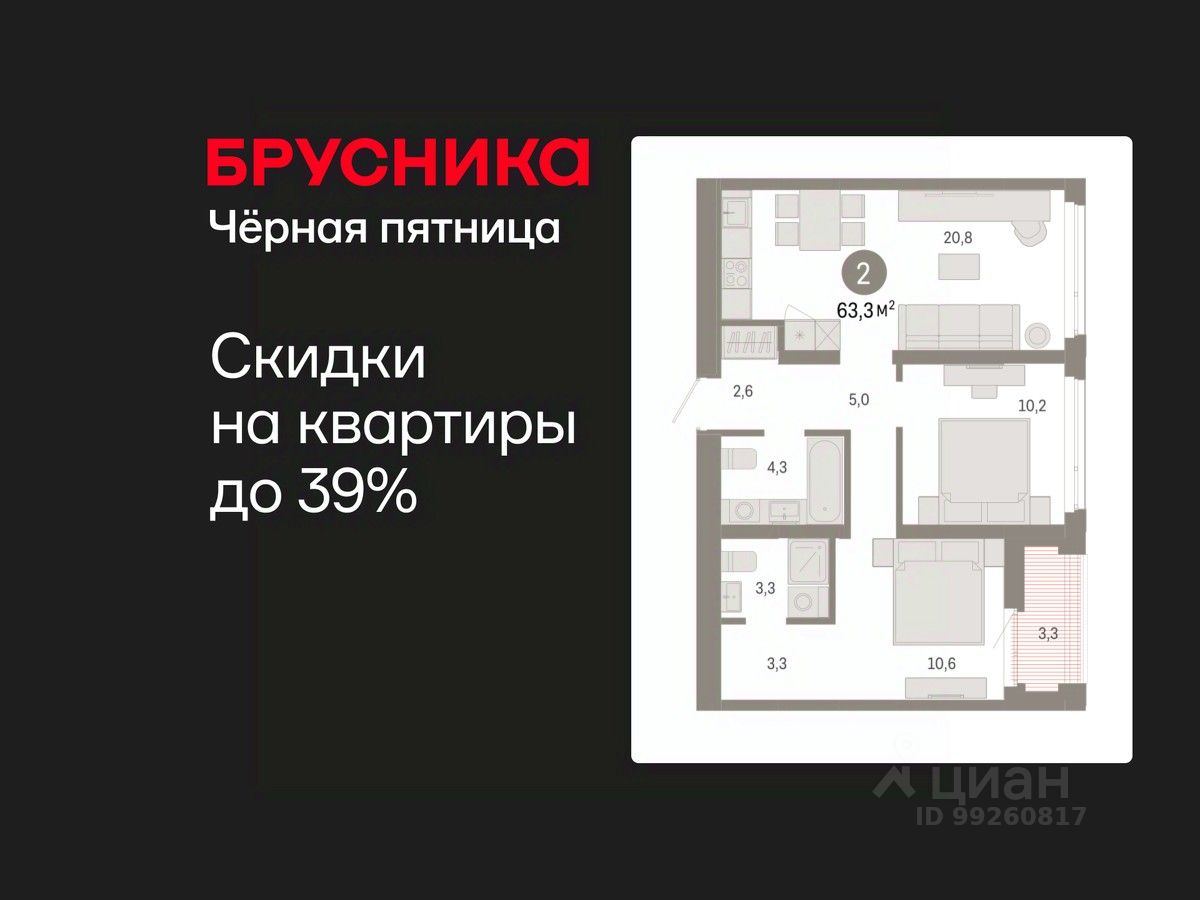 Двухкомнатная квартира с предчистовой отделкой в ЖК "Республики 205" на 9 этаже. Общая площадь: 63.3 кв.м. Высота потолков 2.7 м.