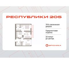 Двухкомнатная квартира с предчистовой отделкой в ЖК "Республики 205" на 4 этаже. Общая площадь: 69.68 кв.м., жилая: 26.4 кв.м., площадь просторной кухни-гостиной: 20.7 кв.м. Комнаты изолированные, все окна выходят на одну сторону. В квартире два балкона, два совмещенных санузла. Высота потолков 2.7 м.