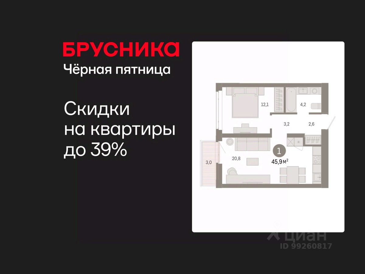 Продается 1-комн. квартира от застройщика с предчистовой отделкой в ЖК "Республики 205" на 7 этаже. Общая площадь: 45.87 кв.м., жилая: 12.1 кв.м., площадь просторной кухни-гостиной: 20.8 кв.м. Все окна выходят на одну сторону. В квартире один балкон, один совмещенный санузел. Высота потолков 2.7 м.