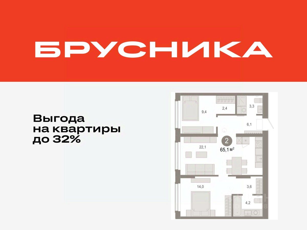 Квартира с кухней-гостиной и двумя спальнями в Октябрьском на Туре. Особенности планировки: второй санузел, гардеробная, разнесённые спальни, предчистовая отделка.