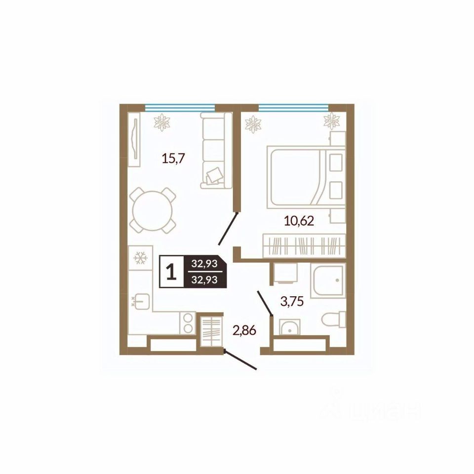 Общая площадь32,93 м²