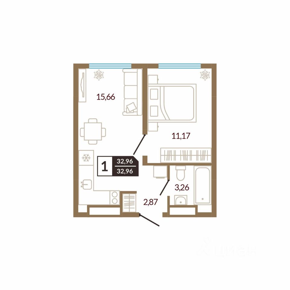 Общая площадь32,96 м²