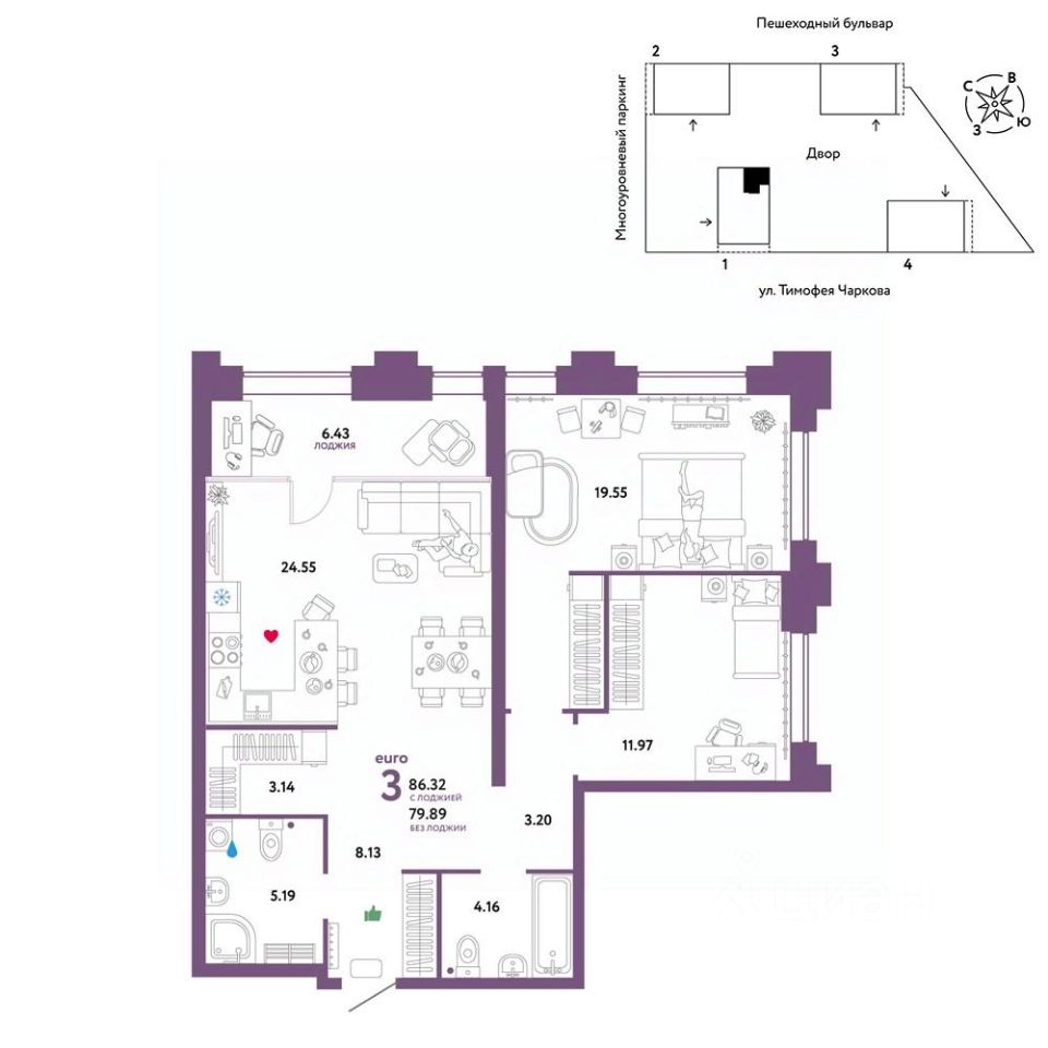 Продается 3комнатная квартира от застройщика "Страна Девелопмент". Стоимость указана без учета акций. Квартира на 15 этаже, площадь квартиры 86,32 кв. м. Сдача — в 3 квартале 2025 года.