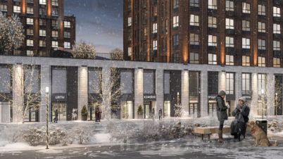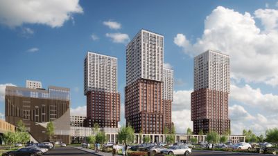 Четыре 32-этажные башни со смещенными осями, объединенные общим стилобатом. На крыше дома появятся детские и спортивные площадки, зоны для релакса и отдыха. А в самом стилобате — торговая галерея и паркинг.