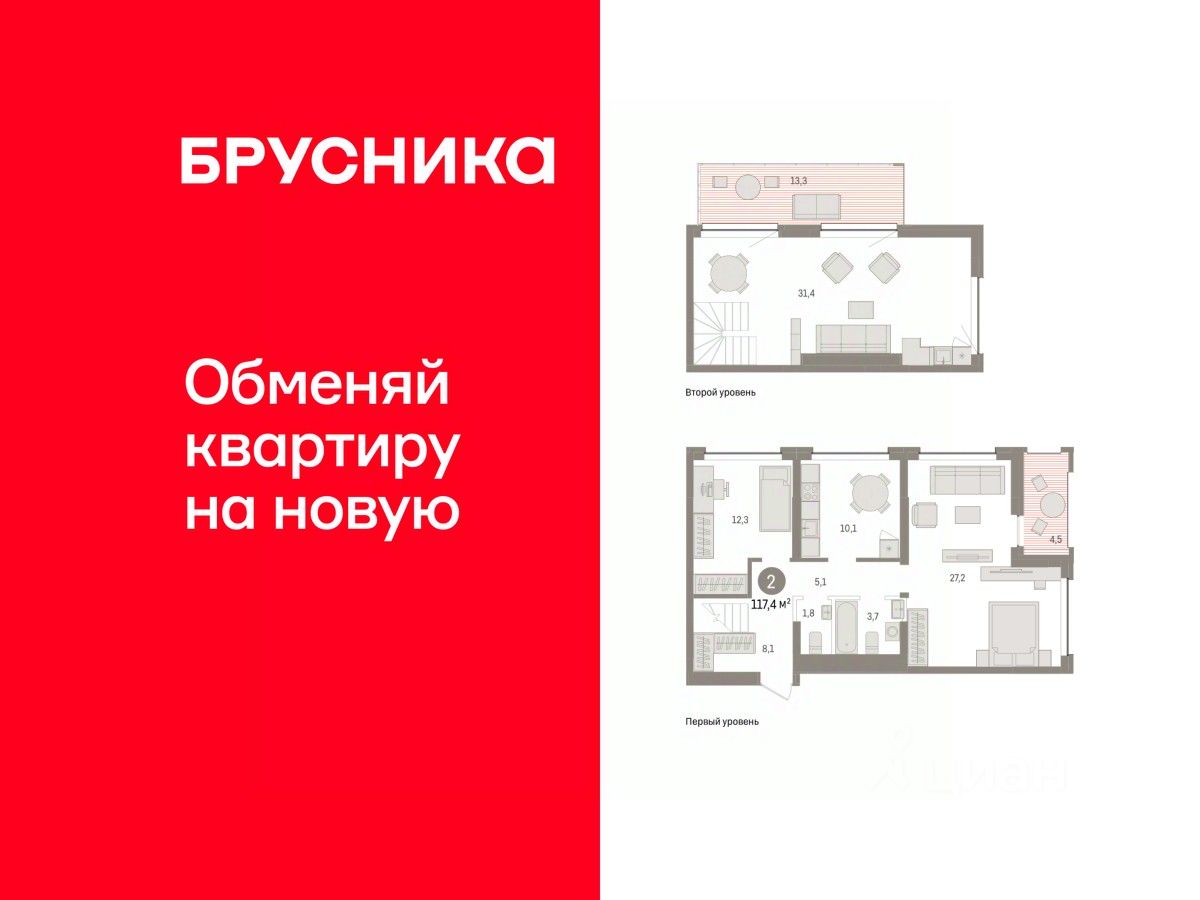Продается двухкомнатная квартира с предчистовой отделкой в ЖК "Дом у озера" на 4 этаже. Общая площадь: 117.37 кв.м. Высота потолков 2.7 м.