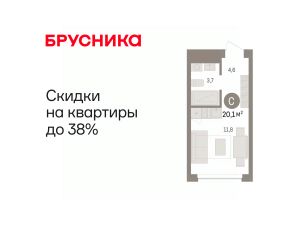 1-комн. студия от застройщика с предчистовой отделкой в ЖК "Дом у озера" на 2 этаже. Общая площадь: 20.07 кв.м., площадь гостиной 11.8 кв.м., из которых 5 кв.м. выделено под кухонную зону. Все окна выходят на одну сторону. В квартире один совмещенный санузел. Высота потолков 2.7 м.