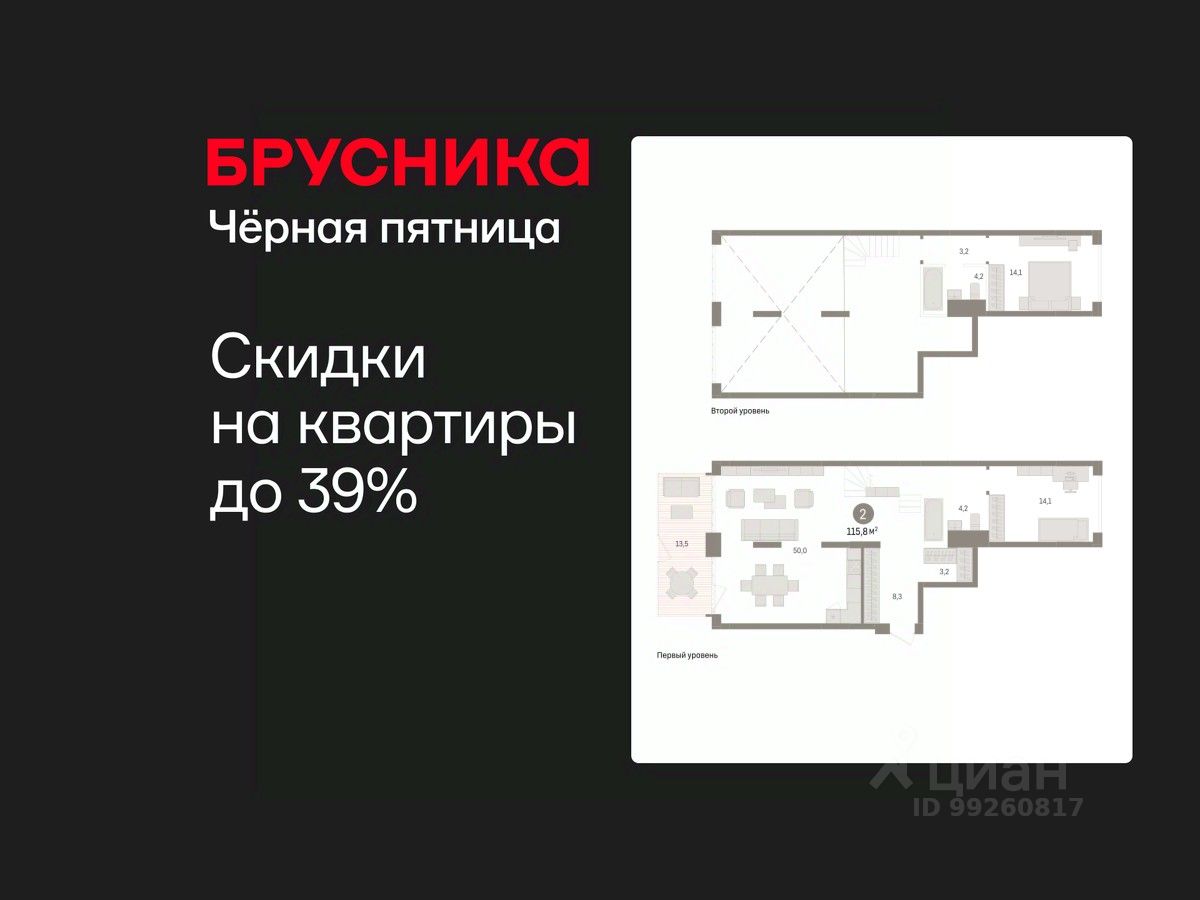 Двухуровневая квартира с кухней-гостиной и двумя спальнями в Доме у озера. Особенности планировки: второй санузел, гардеробная, окна в пол, двухуровневая, вид во двор, отдельный вход, разнесённые спальни, предчистовая отделка, терраса.