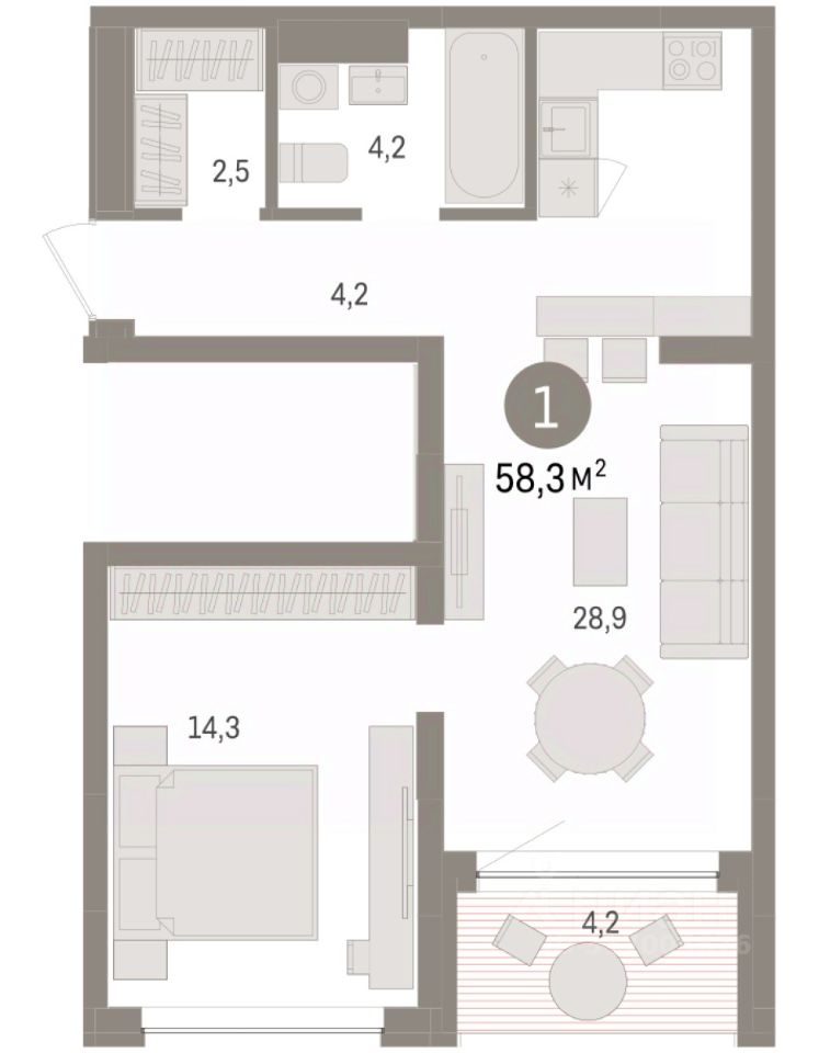 1-комн. квартира от застройщика с предчистовой отделкой в ЖК "Дом у озера" на 2 этаже. Общая площадь: 58.31 кв.м., жилая: 14.3 кв.м., площадь просторной кухни-гостиной: 28.9 кв.м. Все окна выходят на одну сторону. В квартире одна лоджия, один совмещенный санузел. Высота потолков 2.7 м.