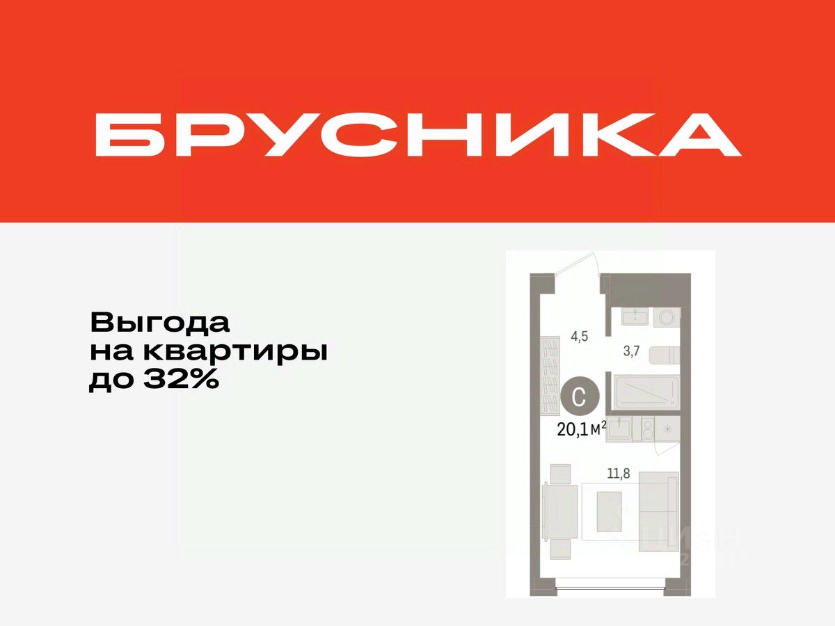 Однокомнатная студия с предчистовой отделкой в ЖК "Дом у озера" на 2 этаже. Общая площадь: 20.07 кв.м., площадь гостиной 11.8 кв.м., из которых 5 кв.м. выделено под кухонную зону. Все окна выходят на одну сторону. В квартире один совмещенный санузел. Высота потолков 2.7 м.