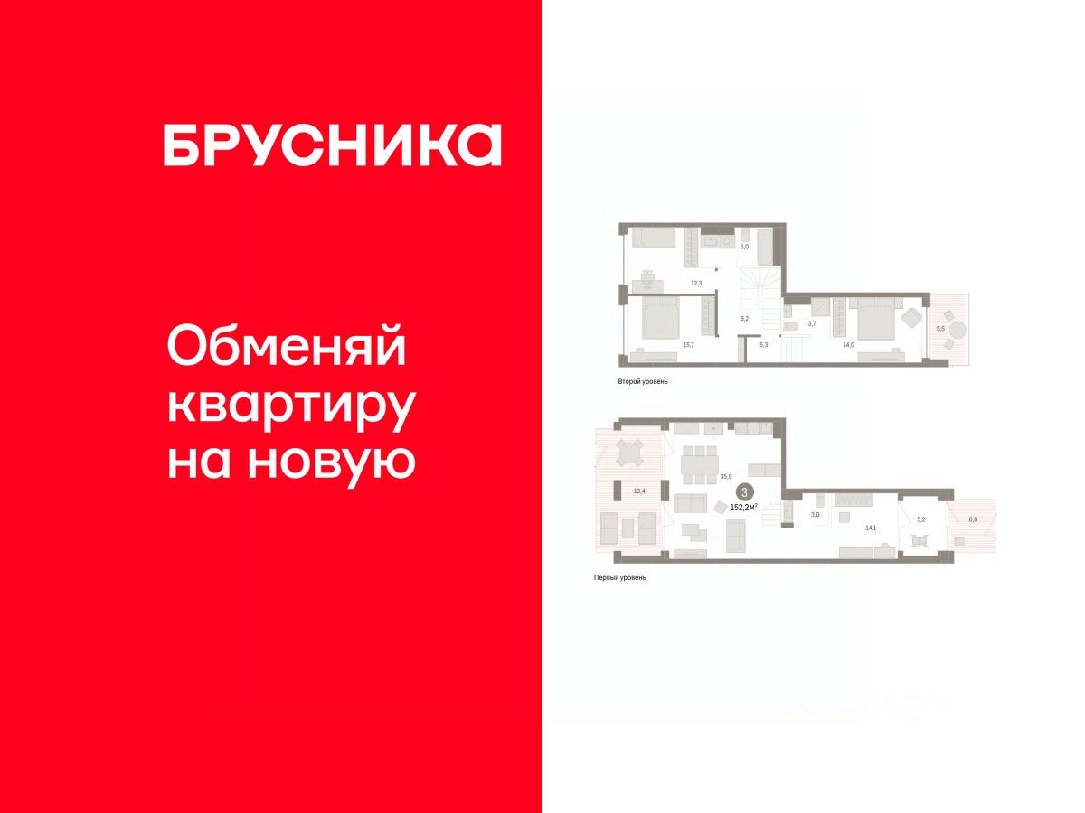 Двухуровневая квартира с кухней-гостиной и тремя спальнями в Доме у озера. Особенности планировки: балкон, вид во двор, второй санузел, двухуровневая, окна в пол, окна на две стороны, отдельный вход, предчистовая отделка, разнесённые спальни, терраса.