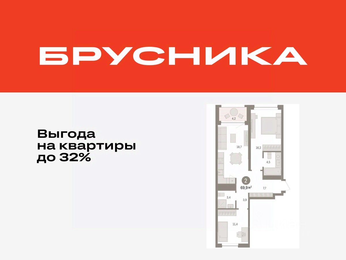 Квартира с кухней-гостиной и двумя спальнями в Доме у озера. Особенности планировки: окна на две стороны, лоджия, разнесённые спальни, предчистовая отделка, мастер-спальня.