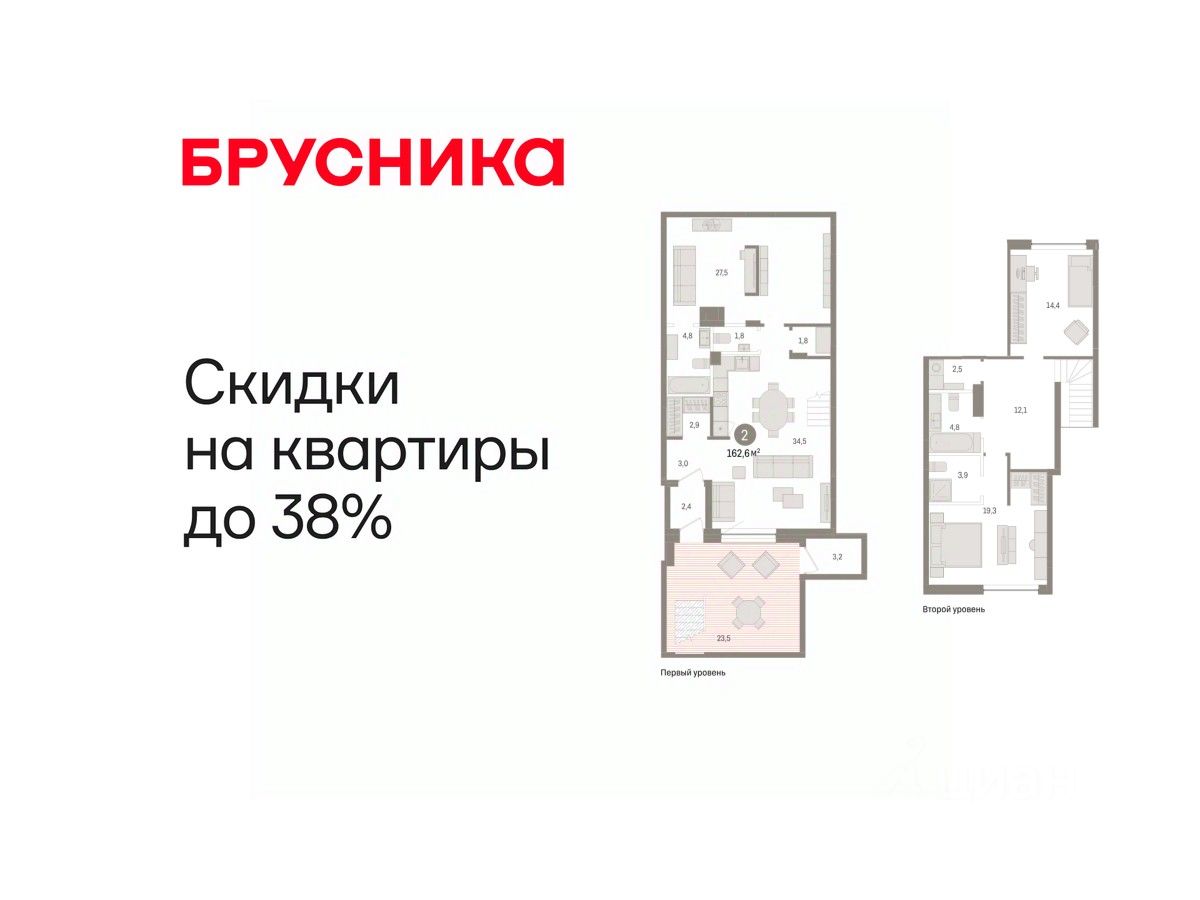 Двухуровневая квартира с кухней-гостиной и двумя спальнями в Доме у озера. Особенности планировки: вид во двор, второй санузел, второй свет, гардеробная, двухуровневая, мастер-спальня, окна в пол, окна на две стороны, отдельный вход, постирочная, предчистовая отделка, разнесённые спальни, стактхаус, терраса на крыше.