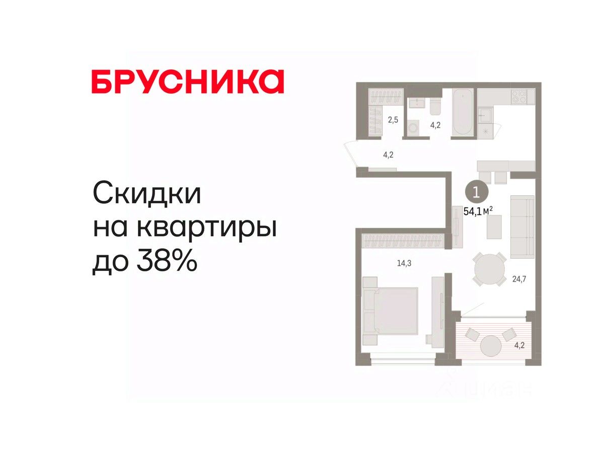 1-комн. квартира с предчистовой отделкой в ЖК "Дом у озера" на 6 этаже. Общая площадь: 54.11 кв.м., жилая: 14.3 кв.м., площадь просторной кухни-гостиной: 24.7 кв.м. Все окна выходят на одну сторону. В квартире одна лоджия, один совмещенный санузел. Высота потолков 2.7 м.