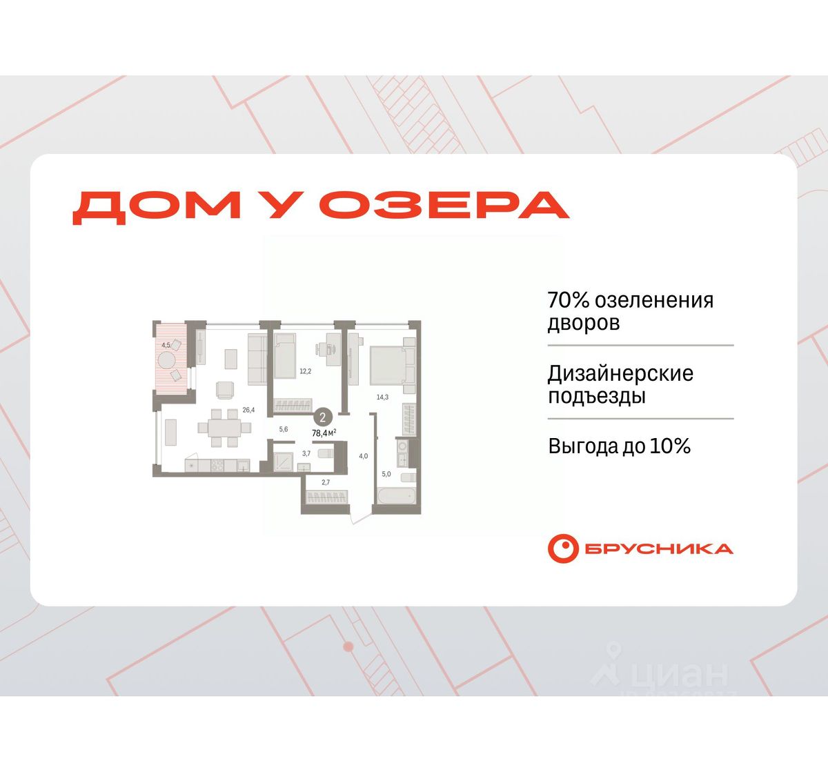 Продается 2-комн. квартира с предчистовой отделкой в ЖК "Дом у озера" на 5 этаже. Общая площадь: 78.37 кв.м., жилая: 26.5 кв.м., площадь просторной кухни-гостиной: 26.4 кв.м. Квартира угловая, очень светлая, естественная вентиляция при открытии окон. В квартире одна лоджия, два совмещенных санузла. Высота потолков 2.7 м.