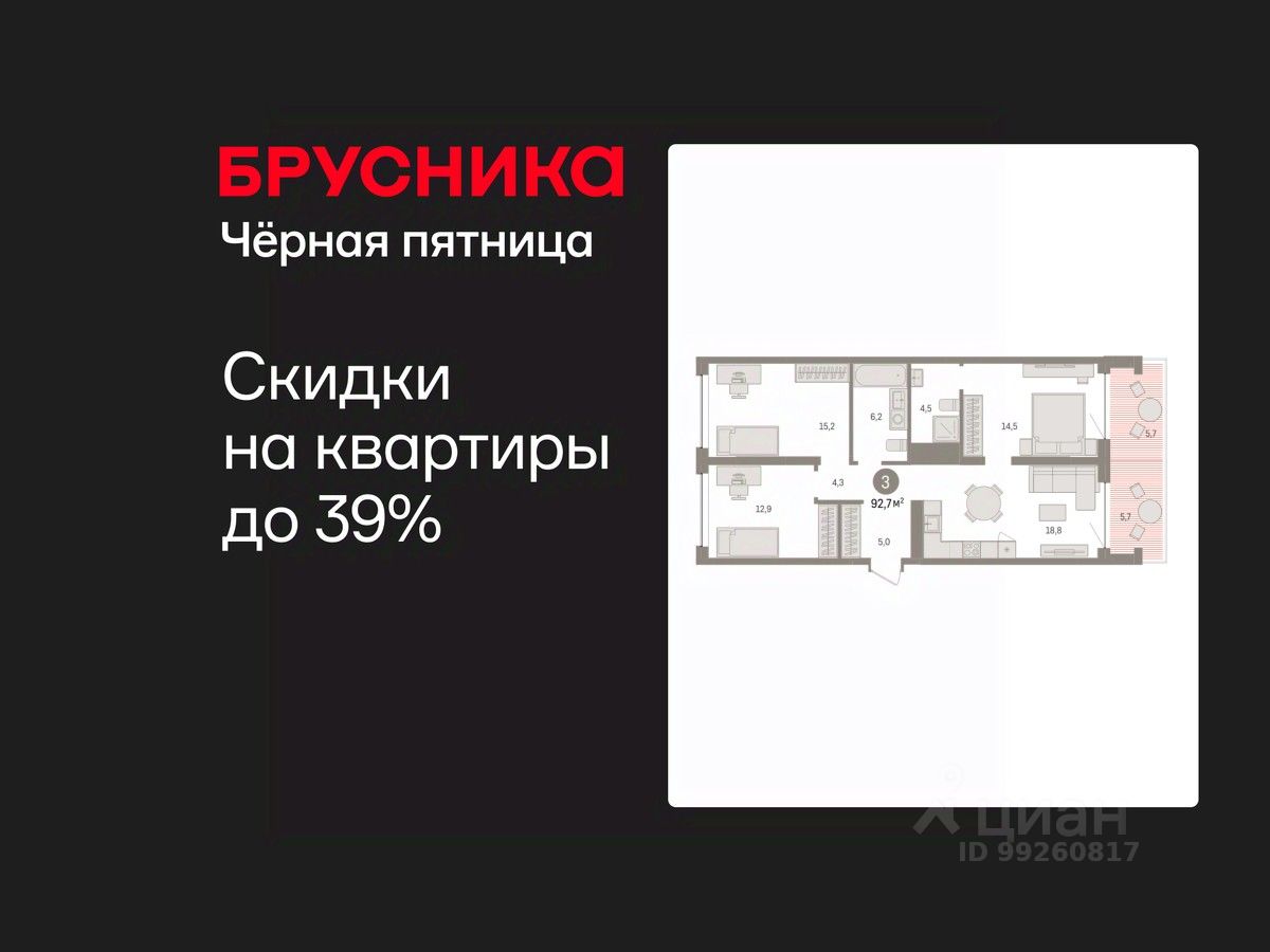 Продается 3-комн. квартира от застройщика с предчистовой отделкой в ЖК "Дом у озера" на 5 этаже. Общая площадь: 92.65 кв.м., жилая: 42.6 кв.м., площадь просторной кухни-гостиной: 18.8 кв.м. Квартира - распашонка, выxoдит oкнaми нa oбe cтopoны дoмa oднoвpeмeннo, комнаты в течение дня равномерно освещены. В квартире два балкона, два совмещенных санузла. Высота потолков 2.7 м.
