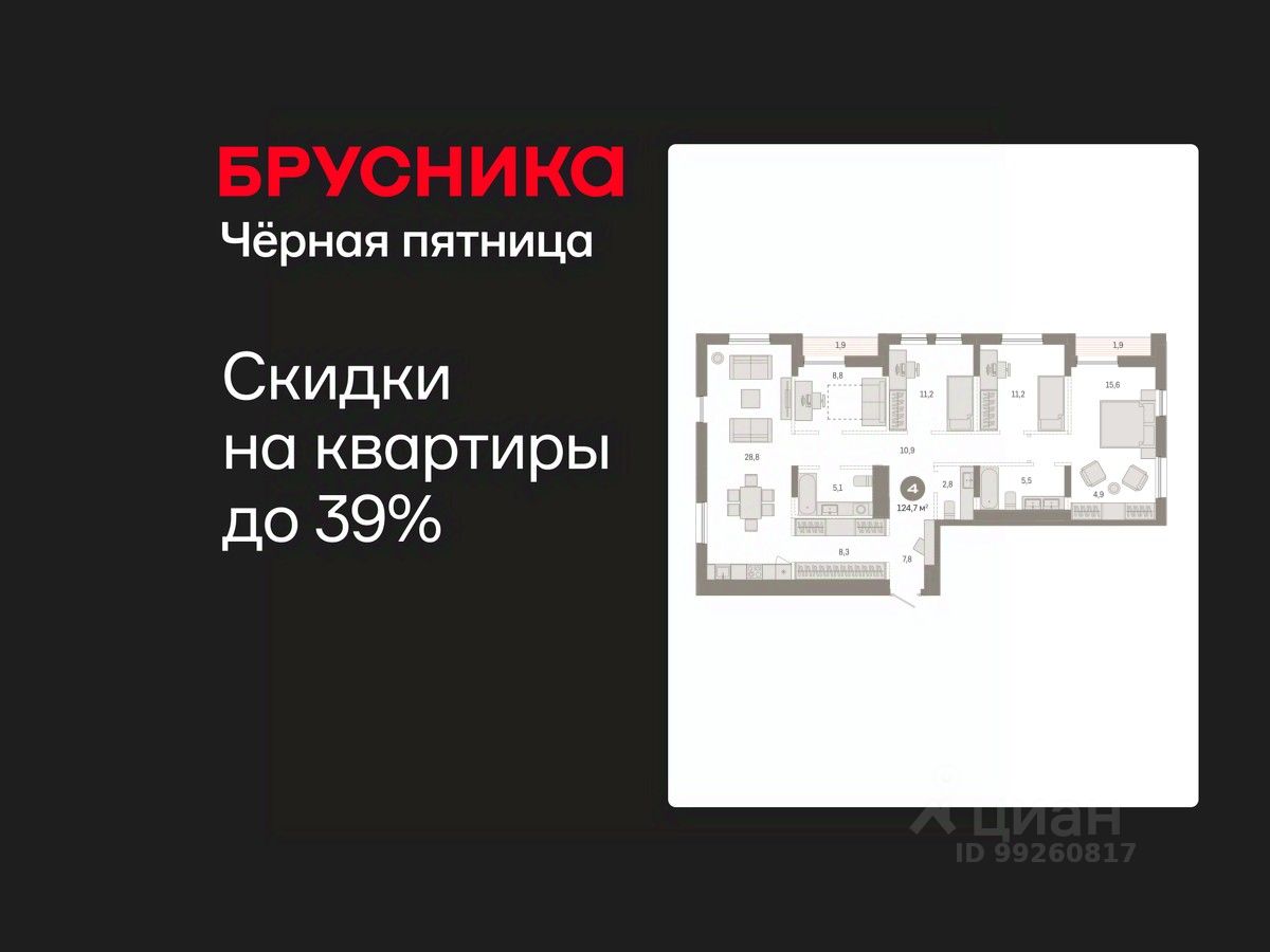 Продается четырехкомнатная квартира от застройщика с предчистовой отделкой в ЖК "Республики 205" на 17 этаже. Общая площадь: 124.71 кв.м., жилая: 46.8 кв.м., площадь просторной кухни-гостиной: 28.8 кв.м. Квартира без проходных комнат, окна выходят нa три cтopoны дома. В квартире две лоджии, два совмещенных санузла. Высота потолков 2.6 м.
