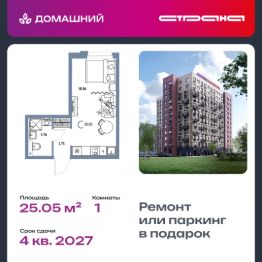 Продается 1комнатная квартира на 6 этаже от застройщика Страна Девелопмент. Площадь квартиры 25,05 кв. м.