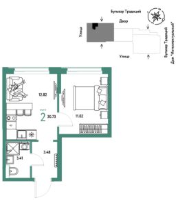 Продается 2комнатная квартира на 8 этаже от застройщика Страна Девелопмент. Площадь квартиры 30,73 кв. м.