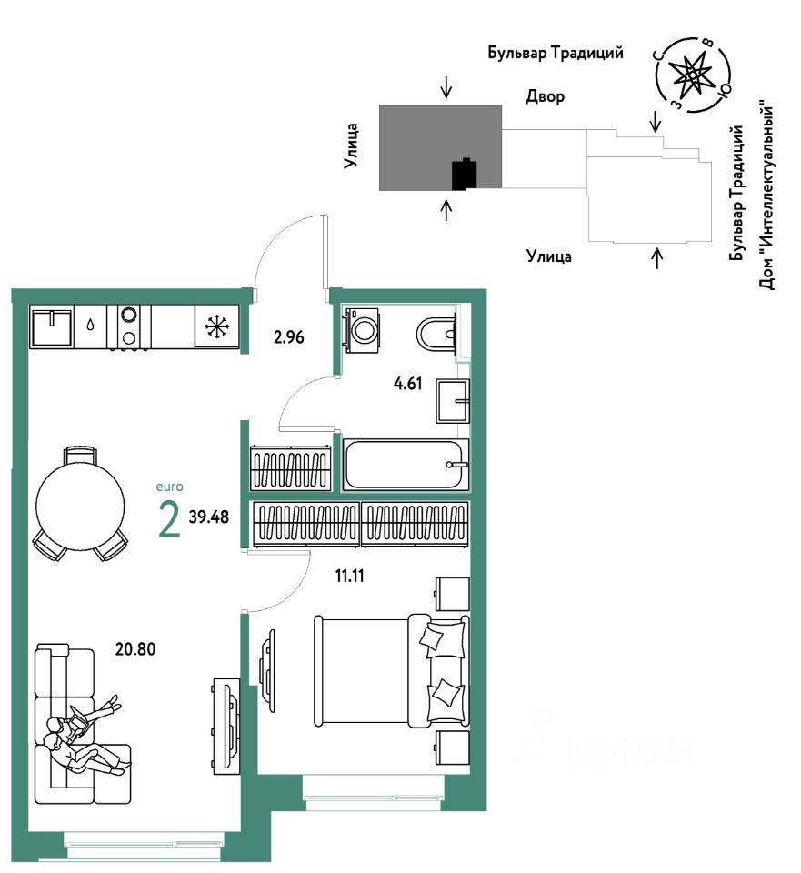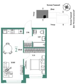 Продается 2комнатная квартира на 9 этаже от застройщика Страна Девелопмент. Площадь квартиры 39,48 кв. м.