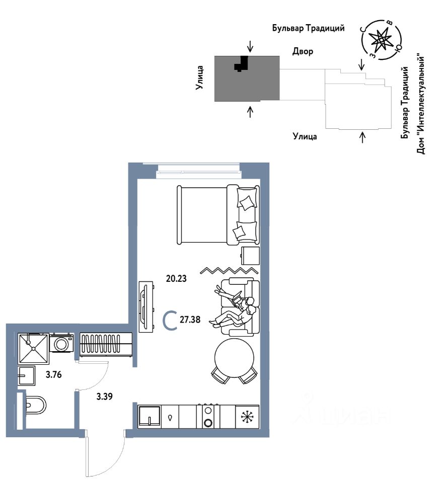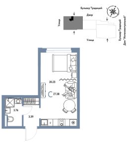 Продается 1комнатная квартира на 10 этаже от застройщика Страна Девелопмент. Площадь квартиры 27,38 кв. м.