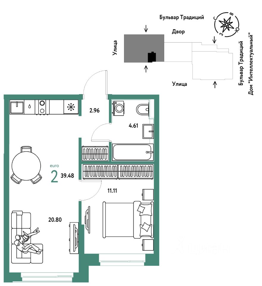 Продается 2комнатная квартира на 11 этаже от застройщика Страна Девелопмент. Площадь квартиры 39,48 кв. м.