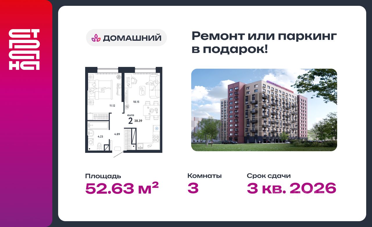 Новая квартира в ЖК "Домашний" напрямую от федеральной группы компаний "Страна Девелопмент". Финансовый партнер — банк "ДОМ.РФ".