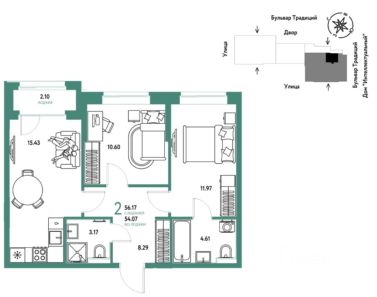 Продается 2комнатная квартира на 2 этаже от застройщика Страна Девелопмент. Площадь квартиры 56,17 кв. м.
