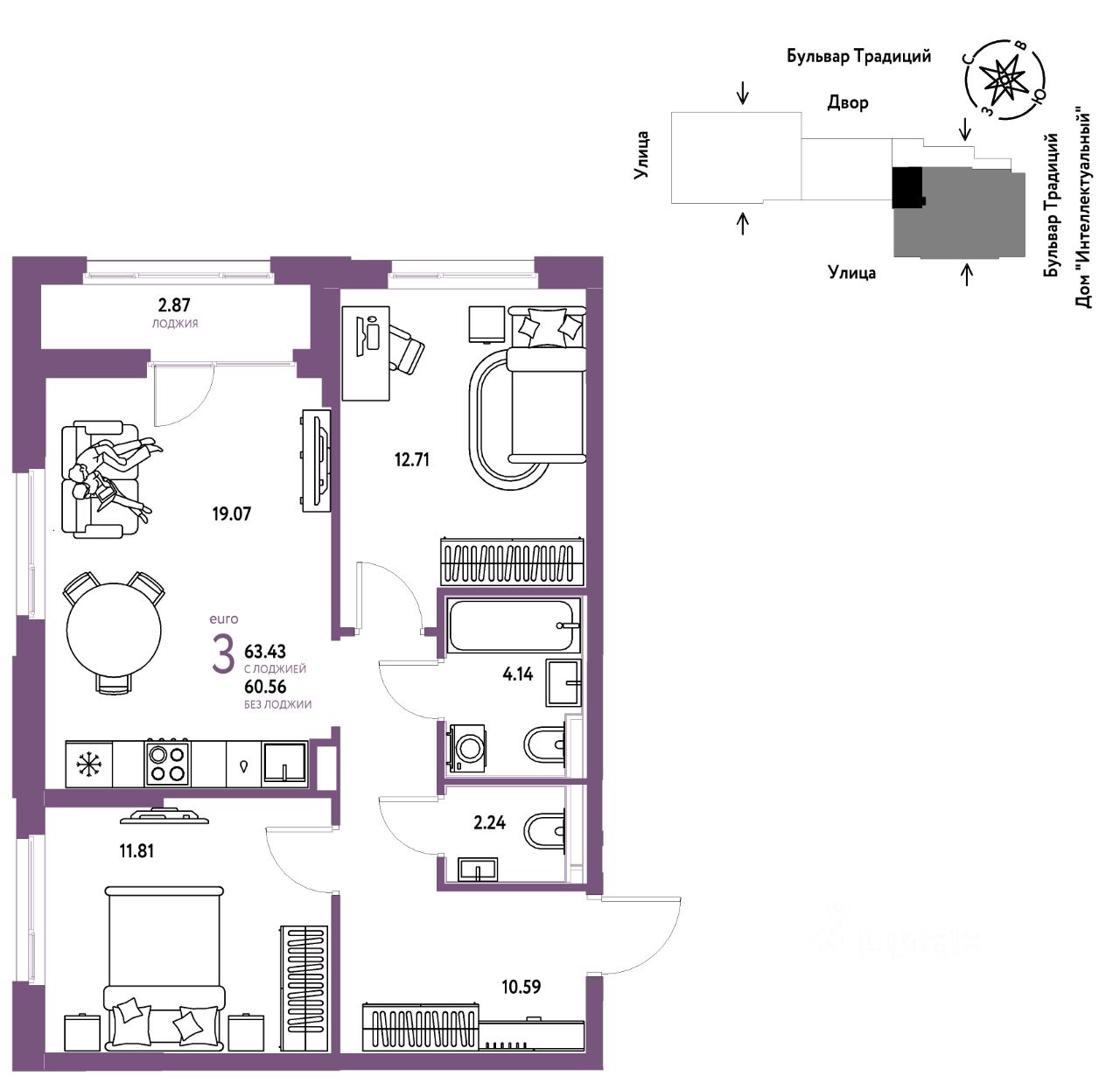 Продается 3комнатная квартира на 3 этаже от застройщика Страна Девелопмент. Площадь квартиры 63,43 кв. м.
