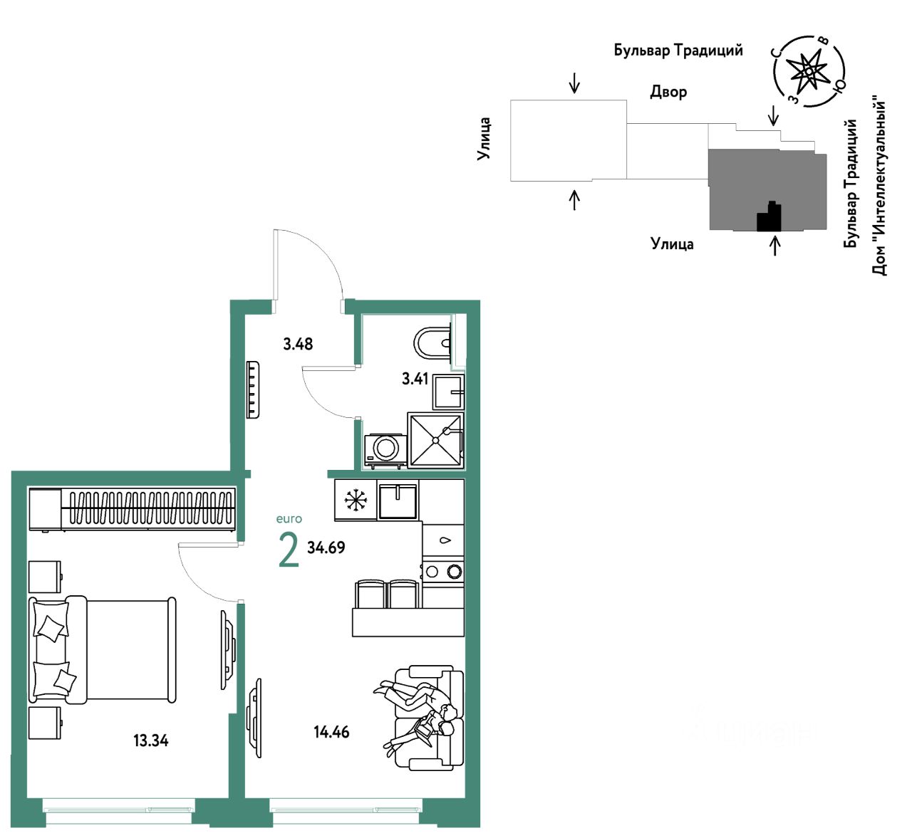 Продается 2комнатная квартира на 3 этаже от застройщика Страна Девелопмент. Площадь квартиры 34,69 кв. м.