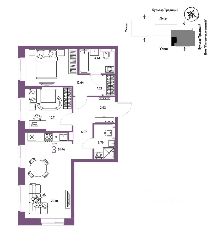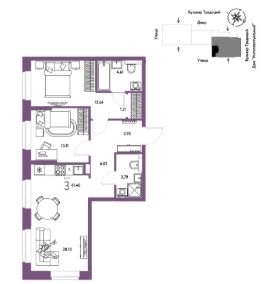 Продается 3комнатная квартира на 4 этаже от застройщика Страна Девелопмент. Площадь квартиры 61,46 кв. м.