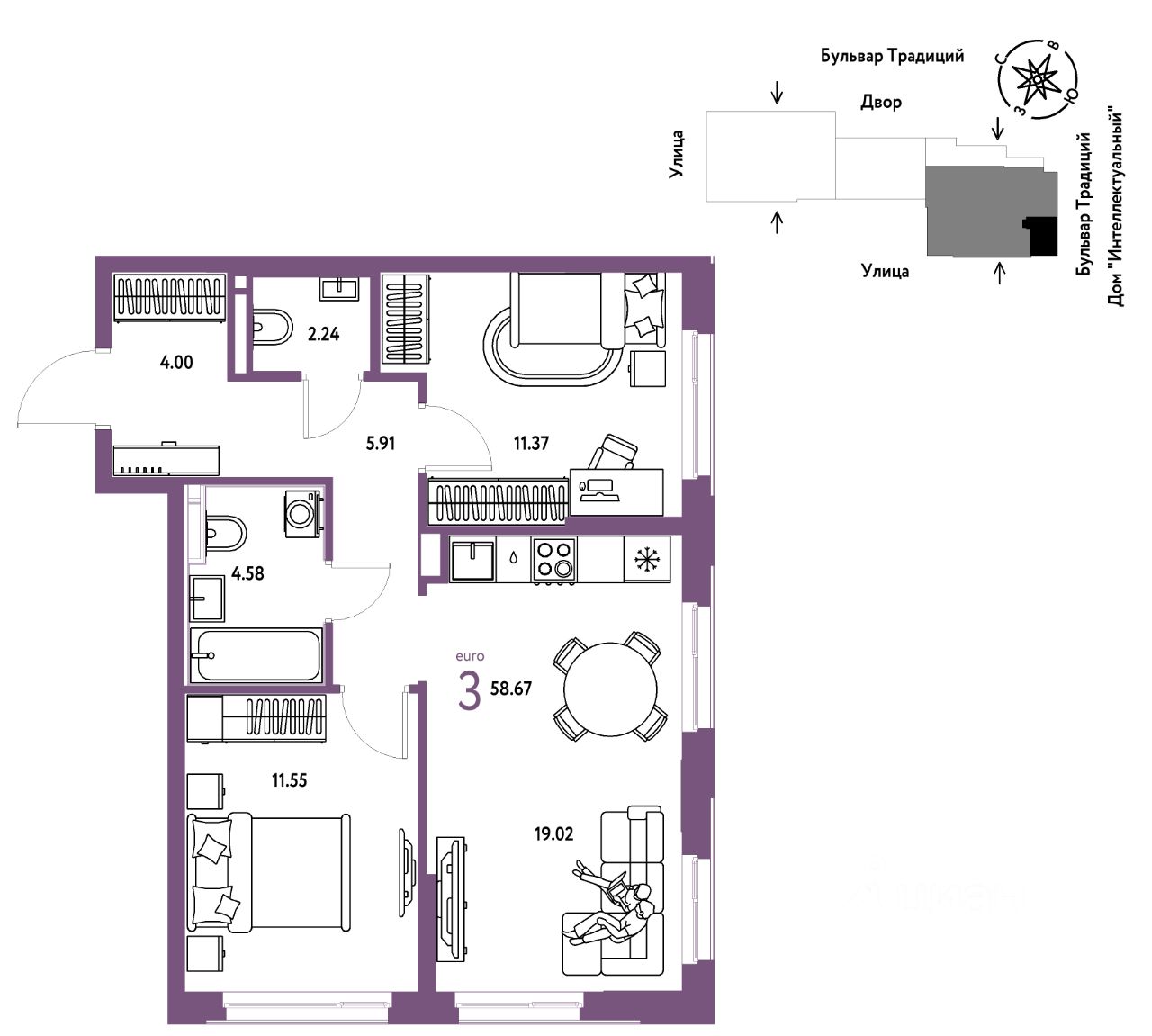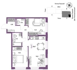 Продается 3комнатная квартира на 6 этаже от застройщика Страна Девелопмент. Площадь квартиры 58,67 кв. м.