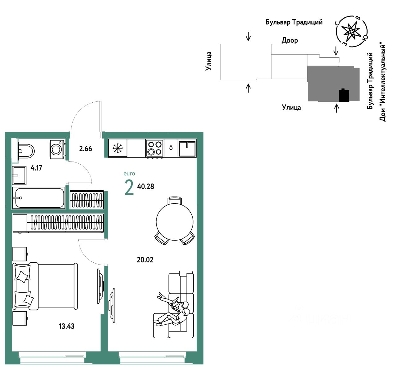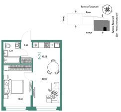 Продается 2комнатная квартира на 6 этаже от застройщика Страна Девелопмент. Площадь квартиры 40,28 кв. м.